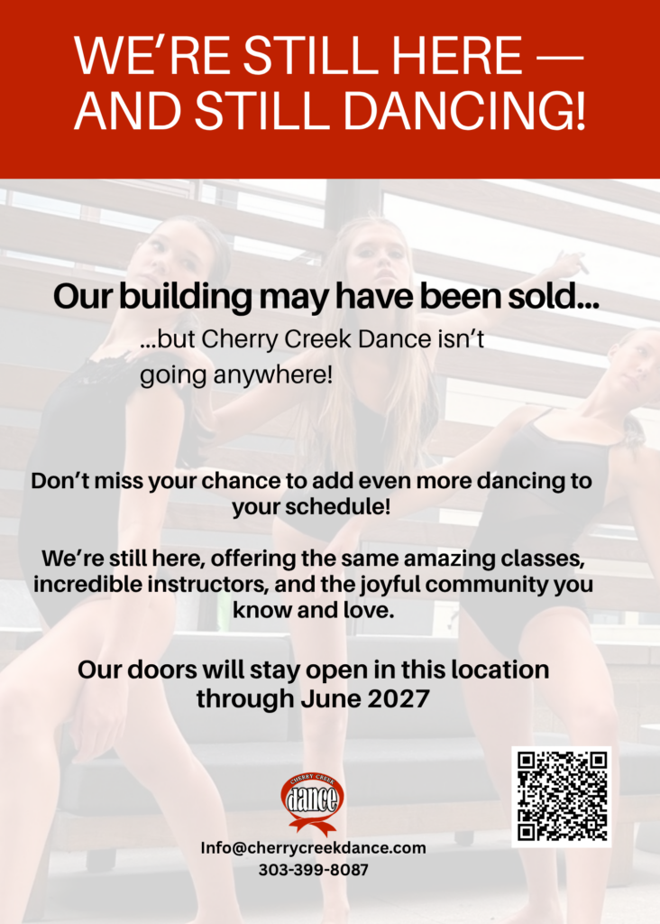 Cherry Creek Dance is at the forefront of the Denver arts community and plays an integral role as both an instructional institution and an advocate for the arts. Remember that dance, in all its forms, is an art. Its traditions are represented through proper conduct and appreciation of all those who participate in its creation. Enjoy the art of dancing and respect your fellow dancers, teachers, the studio, and yourself.